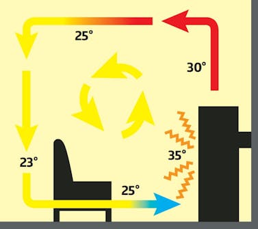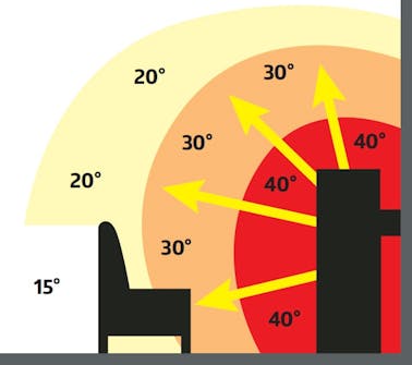 Nära kaminen blir det väldigt varmt. Ju större avstånd från kaminen, desto svalare blir det.