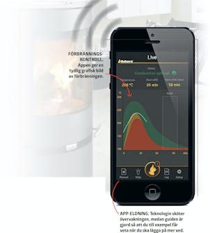Om du vill använda appen förutsätter det att en temperatursensor kan monteras på rökröret. Appen hämtas gratis i App-store eller Google Play, och temperatursensorn kostar 799 kr.