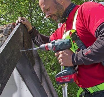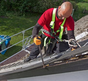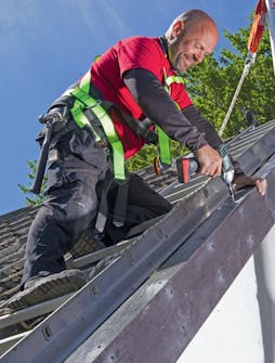 Säkerheten kommer först! Till arbetet behöver du en ställning eller stege och en stege att lägga på taket. Du ska använda fallskyddssele eller -väst och de rep eller linor du använder ska förankras rätt. Du får inte fästa repet för långt ifrån dig i sidled. Skulle du ramla, så är det inte kul att hänga ett par meter över marken och pendla fram och tillbaka.