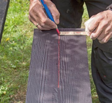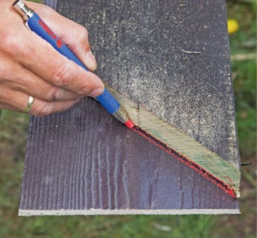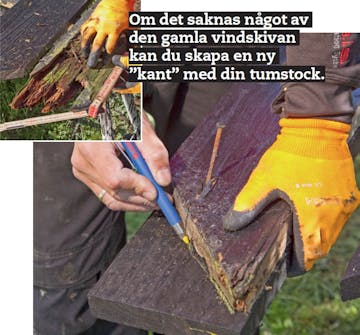 Kapa cementfiberbrädorna som ska sitta utanpå vindskivorna. Lägg den nya vindskivan längs ovankanten på cementfiberbrädan, markera längs kortändarna och långsidan och såga.
