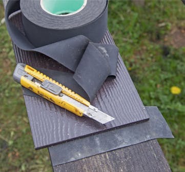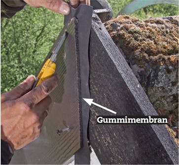 Skarvning av cementfiberbrädor. Om dina vindskivor är längre än 360 cm, som är längden på cementfiberbrädorna, så ska de senare skarvas med gummi-mebran på baksidan för att skydda träet.