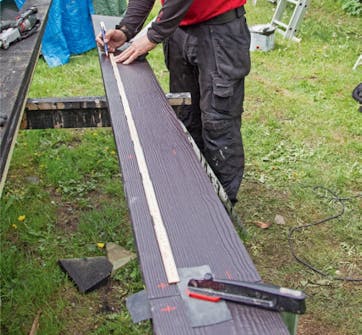När brädorna sitter på plats ska du skruva fast cementfiberbrädorna på rätt ställe, så det är klokt att först ha märkt dem så att du vet var de ska sitta.