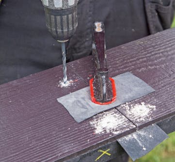 Skruva fast vattbrädorna. Förborra i linje med skruvarna i vindskivan. Borsta bort borrdamm och torka av innan du skruvar fast brädorna.