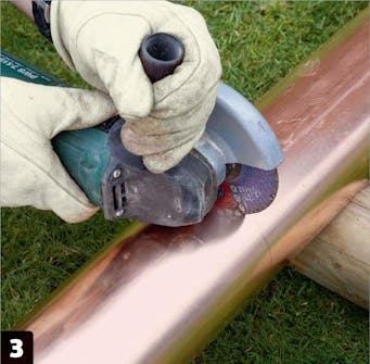 Hängrännan kapas på längden. Med en metallskiva på vinkelslipen kan du enkelt arbeta dig genom kopparen.
