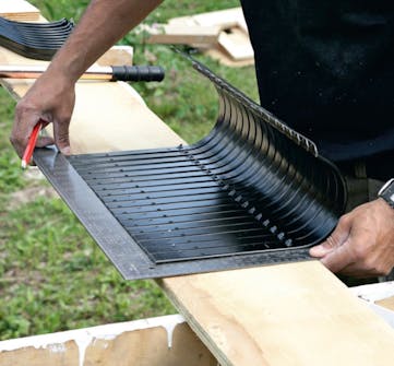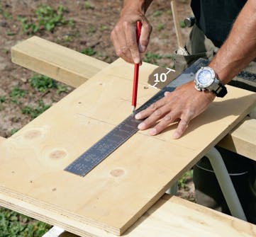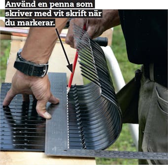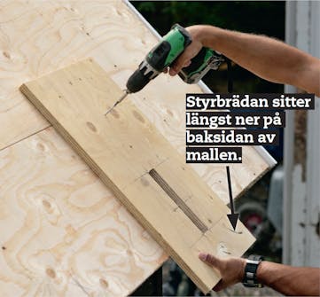 Skruva fast en bräda längst ner på baksidan av mallen. Se till att brädan hamnar vinkelrätt mot urtaget i mallen. Styrbrädan fungerar som anhåll när mallen läggs på taket.