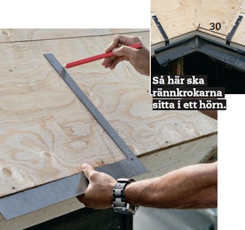 Markera på taket för rännkrokar-na. Det får inte vara mer än 60 cm mellan krokarna. Om du ska runt ett hörn börjar du i hörnet med den första kroken så att den kan stötta i vinkeln.