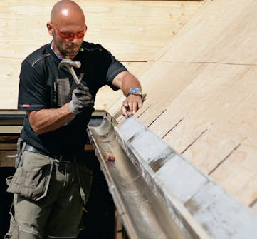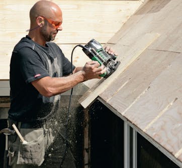 Det är ofta enklast att montera rännkro-kar på takfotsbrädan, särskilt om den är lodrät. Här är den vinklad och då kommer man att se rännkrokarna så vår snickare beslutar sig för att montera rännkrokarna på underlagstaket. Men det innebär att han först måste fräsa spår för dem så att han sedan kan lägga takpapp. Det blir en snygg och diskret lösning men kräver en handöverfräs.