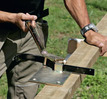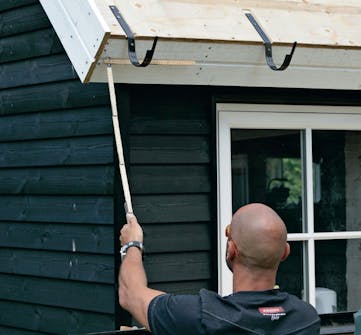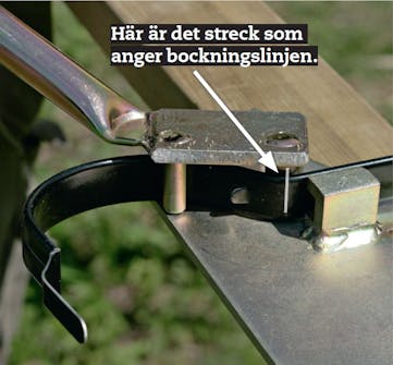 Bocka den första kroken när du har skruvat fast rännjärnsbockaren på en regel. Prova dig fram tills du finner vinkeln. Rännans bakre kant ska ligga 2 mm högre än framkanten så att vatten inte sköljer ner över fasaden.