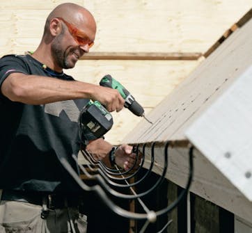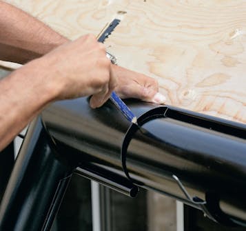 Skjut upp mallen mot kanten på taket. Se till att den sitter längs strecket du har gjort för rännkroken. Fäst mallen med ett par skruvar så att den inte ger sig iväg medan du fräser.