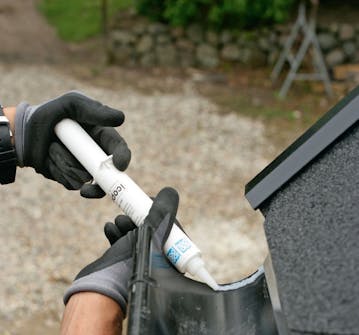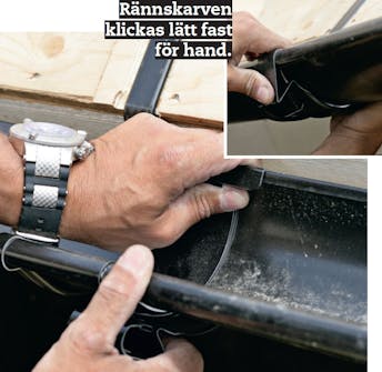 Ränngaveln skjuts in i rännan och knackas fast. Om du har limmat bör du torka bort överflödigt lim direkt. Hinner limmet härda ska det skäras bort.