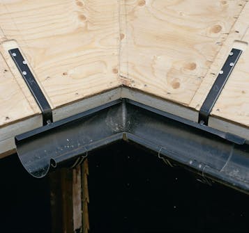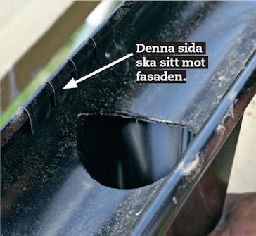 Lägg hängrännan på plats i krokarna så att flikarna som bockats runt kanten hamnar närmast fasaden. Då syns de inte från marken.