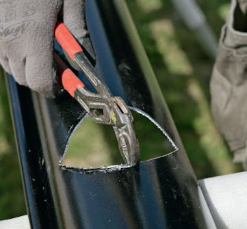 Skarvning utförs enkelt. Skjut ihop de två delarna och spänn fast en rännskarv. Det är en halvrund bygel som är klädd med gummi på insidan.