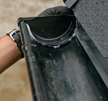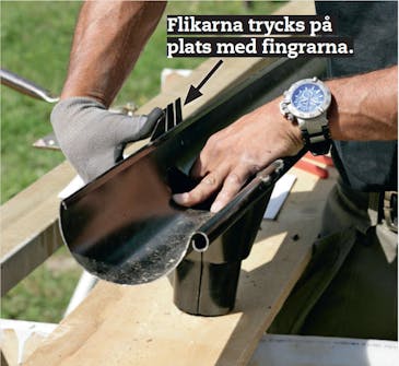 Montera snäppkupan över hålet och bocka flikarna runt kanten på hängrännan. Det är inte nödvändigt att limma fast snäppkupan.