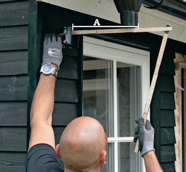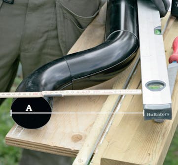 Sätt fast rörböjarna i stupröret. Håll ett vattenpass längs stupröret och kolla att avståndet A från rörböjens yttre kant till stuprörets motsatta sida är lika stort som avståndet mellan rörsvep och snäppkupa.