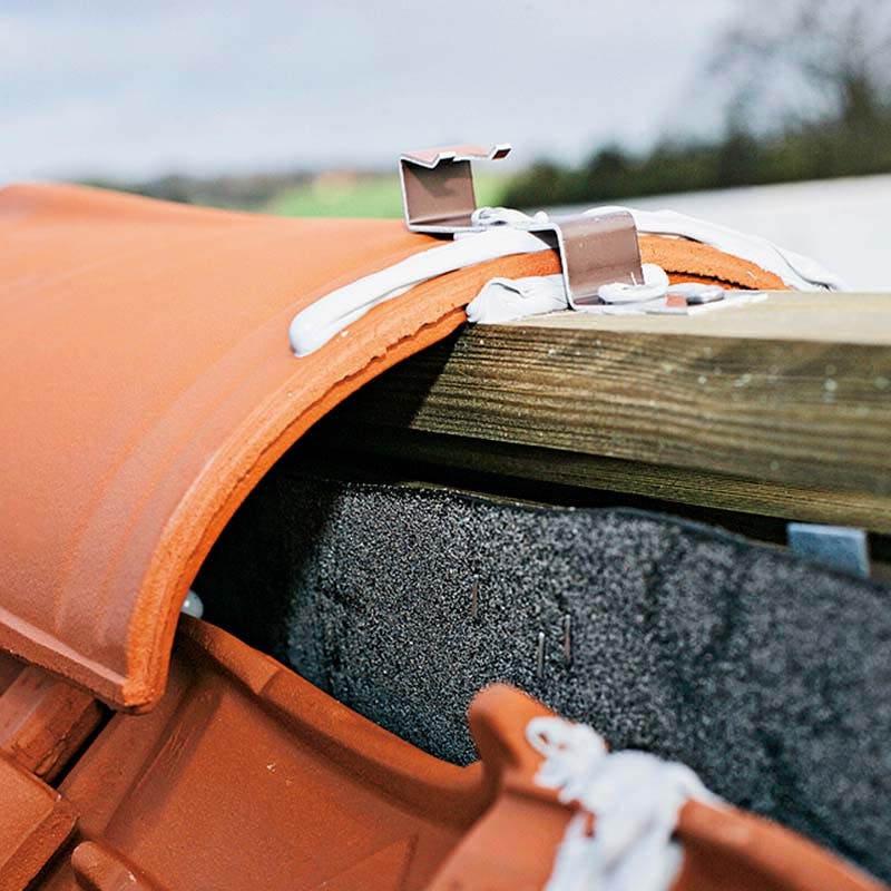 Nockpannorna på takåsen måste tåla när vinden susar och när regn, snö och hagel slår på. Därför är slitaget på nockpannorna stort och det finns en stor risk för att någon förr eller senare spricker. Om du på ett säkert sätt kan ta dig upp till taknocken, går det som tur är väldigt enkelt att byta dem. På det här taket hålls de fast med clips kompletterat med taklim.
