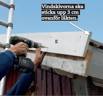 Eftersom taket höjs med takskivornas tjocklek och avståndet till det gamla taket, blir det nödvändigt att sätta upp nya vindskivor E. Det är en fördel att måla vindskivorna först.