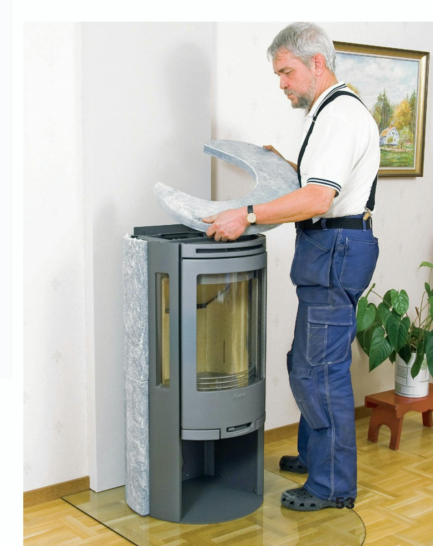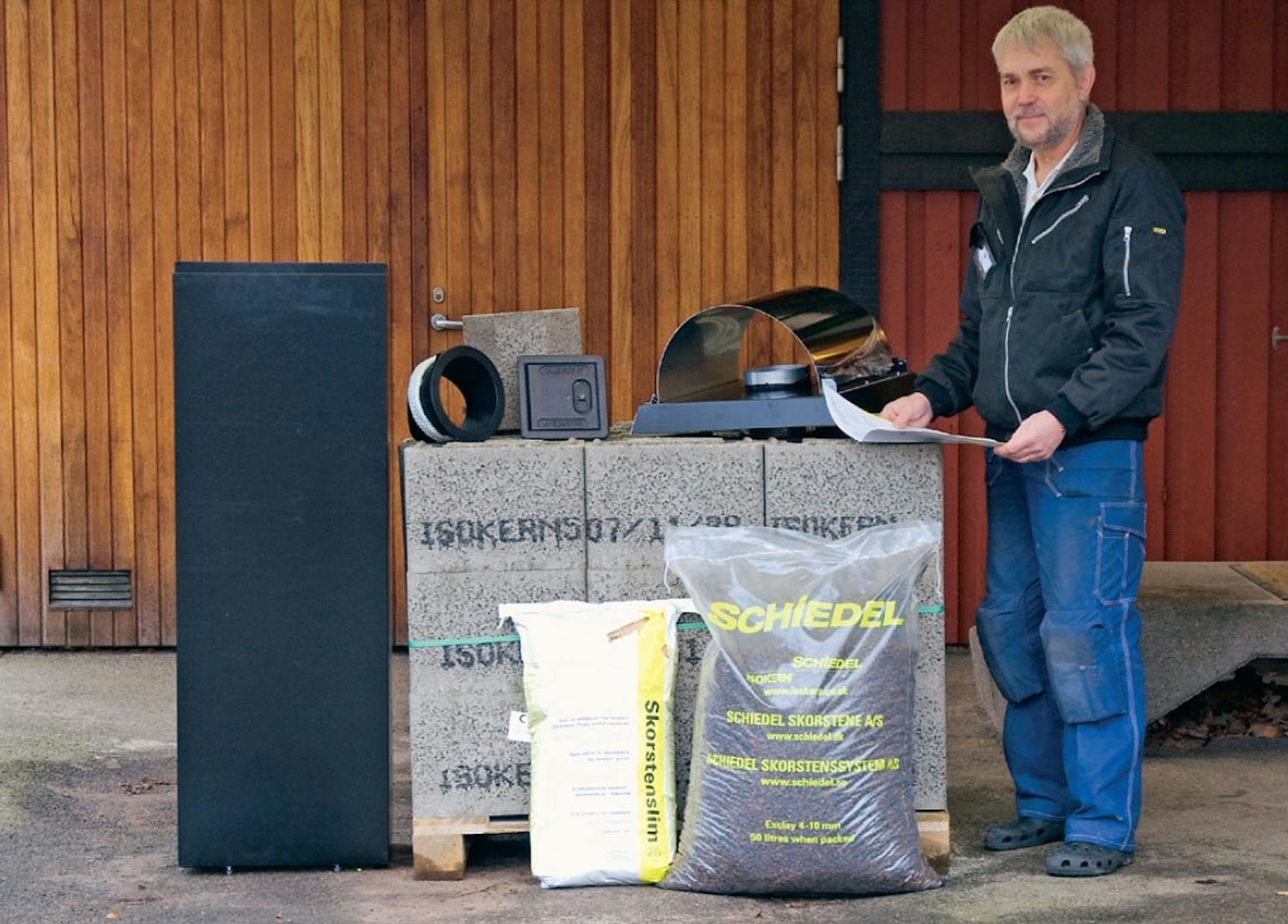 Den skorsten vi bygger heter Isokern, kommer från Schiedel och finns i två varianter. 1. Dubbelmoduler, som kan stå dikt an mot trä. Den kan också armeras för fristående placering. Dubbelmodulen kan innehålla ett eller flera rökrör. Vi monterar dubbelmodul med enkelrör. 2. Den keramiska modulen kan användas till ved, flis, pellets etc, men är lite dyrare. Schiedel, tel. 031-10 70 50, www.schiedel.se
