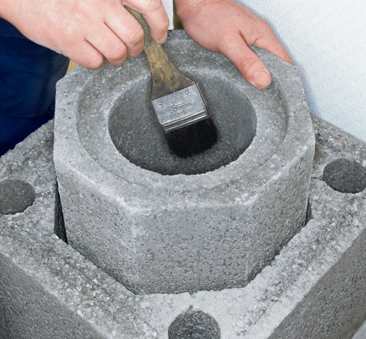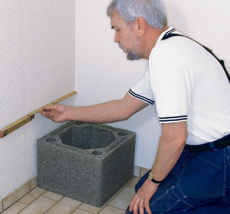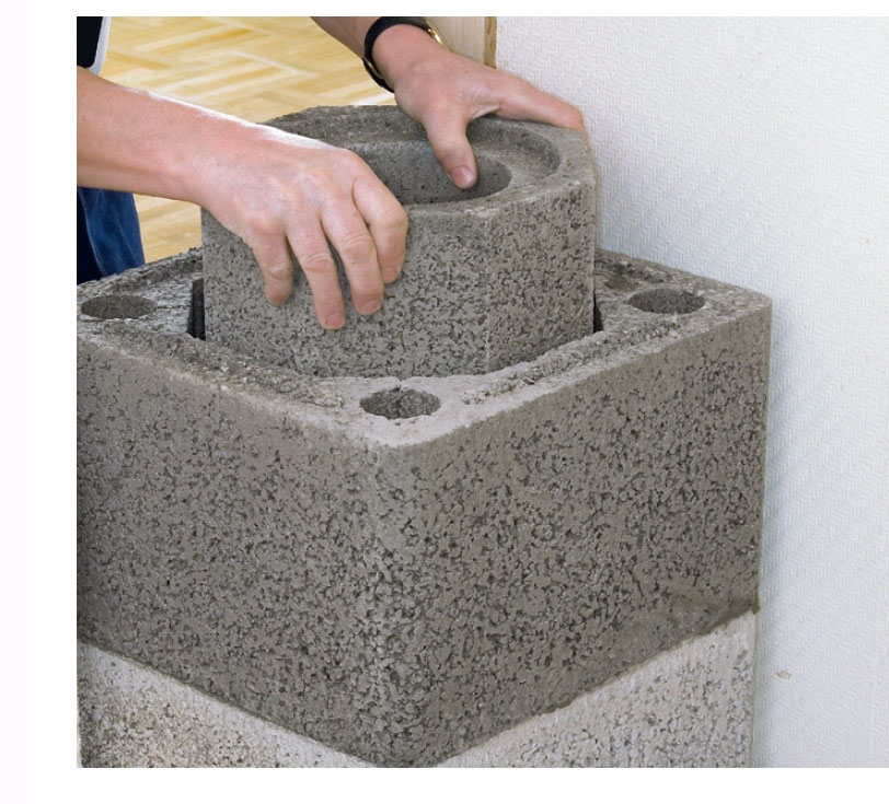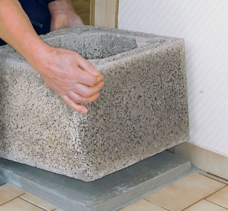 Skorstenen ska stå på ett stadigt, plant och vågrätt underlag. Blocken ska ju limmas ihop och det innebär att du senare inte kan göra annat än små justeringar.