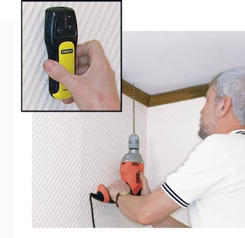 För säkerhets skull borrar vi ett inspektionshål i väggen. För det är inte alltid som enklare detektorer finner alla kablar, rör och reglar. Med en liten spegel och en ficklampa kan vi nu undersöka hur det ser ut inuti väggen.