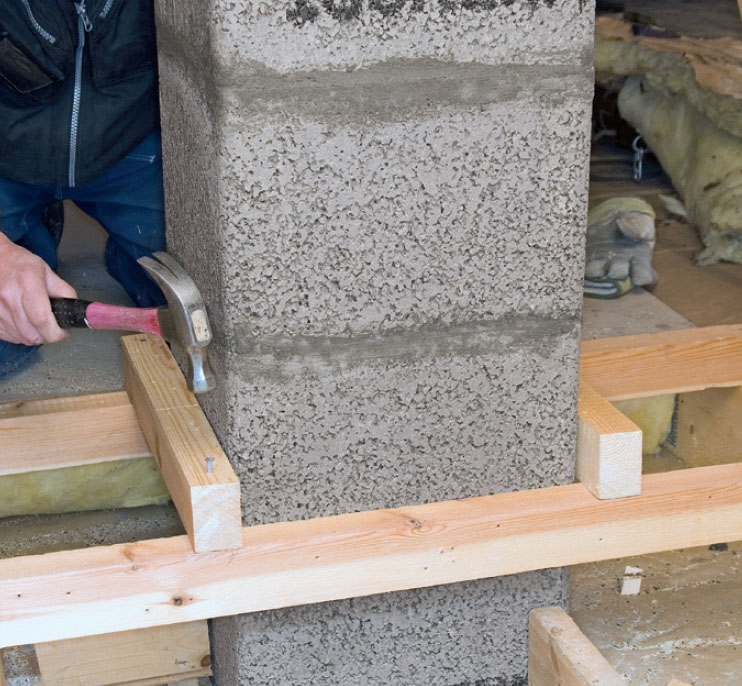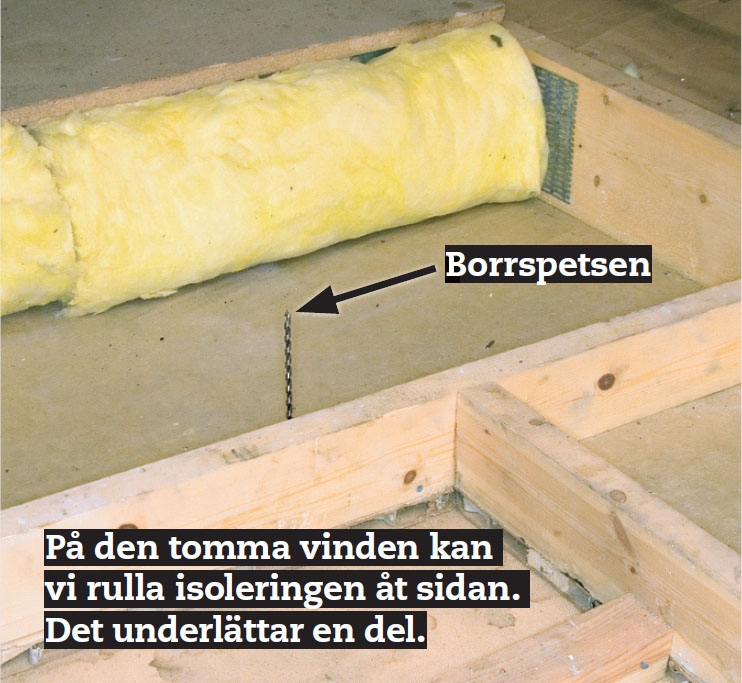 Det är en fördel att vara två, en på vinden och en i rummet, när blocken under och i bjälklaget sätts på plats. TIPS: Såga hålet lite för litet, men utvidga det när du närmar dig med blocken. Då får hålet den storlek det ska ha.