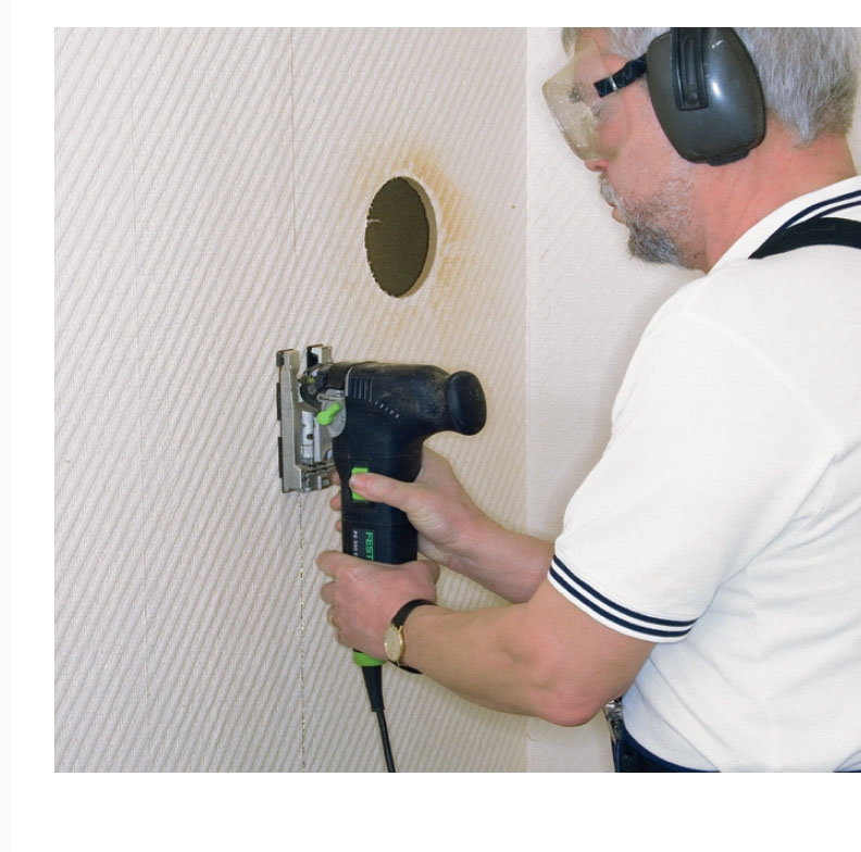 Hålet för skorstenen sågas med sticksåg. Om du är bara det allra minsta nervös för att det finns ett rör i väggen, så borrar du bara flera inspektionshål från golv till tak, stänger av strömmen och använder en batterimaskin.