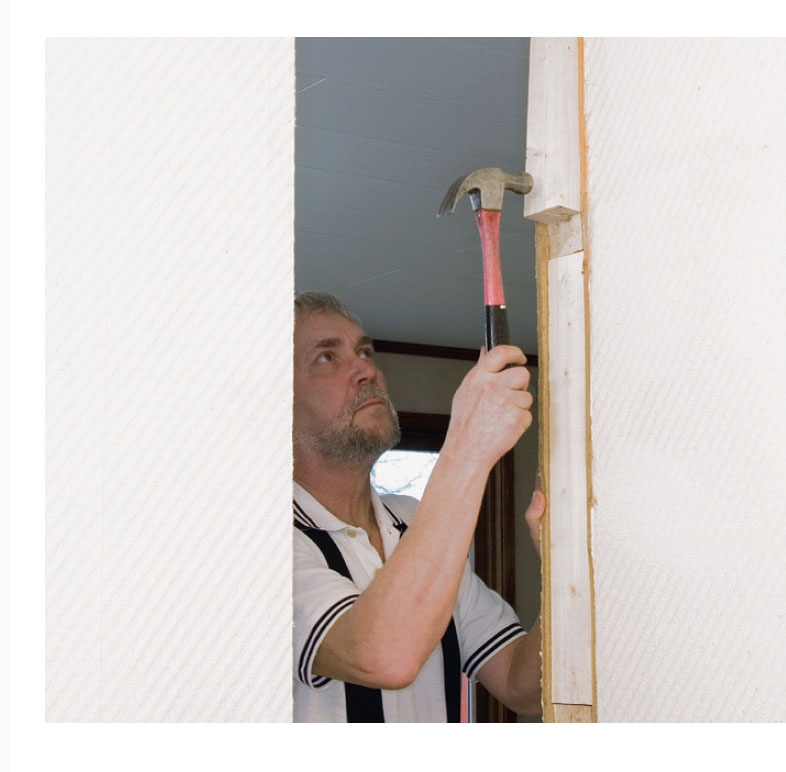 Kanterna i hålet förstärks med reglar. Väggen är varken bärande eller stabiliserande, så det handlar bara om att få skivorna och väggen stöttade.