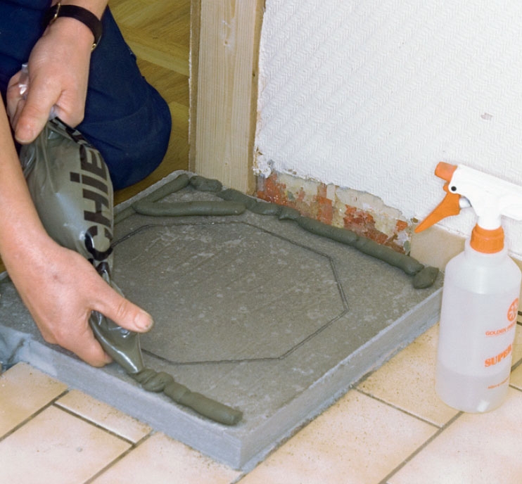 Limmet blandas och läggs ut för det första blocket. Det ska vara så mjukt att det lätt kan tryckas ut ur plastpåsen som medföljer byggsatsen. VIKTIGT! Är sockeln helt torr fuktas den lite så att den inte suger ut fukten ur limmet.