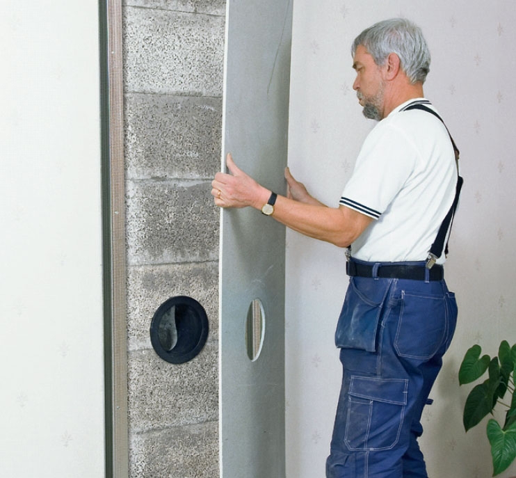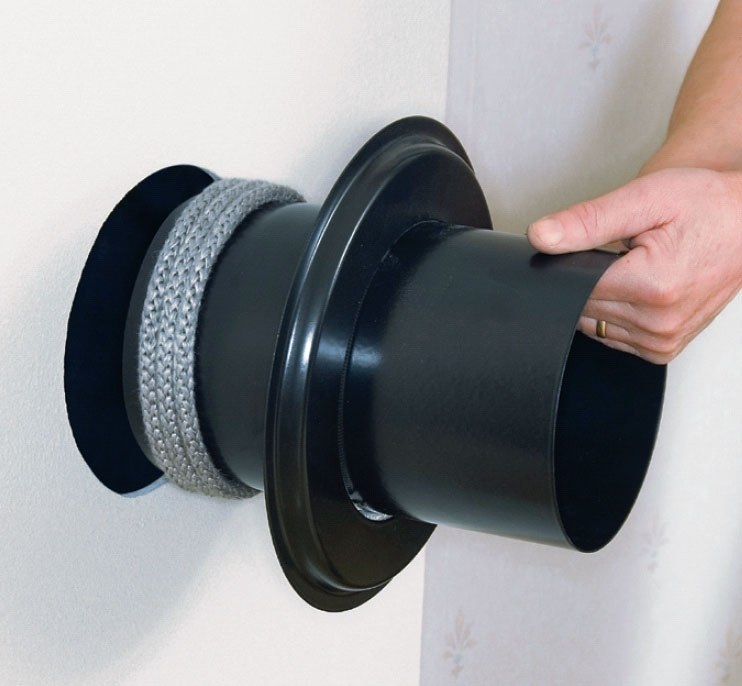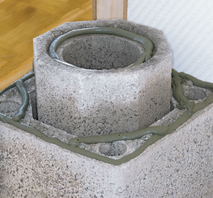 Utrymmet mellan kärnan och manteln tätas med mineralull när hålet har försetts med släta kanter, men innan sotningsluckan sätts på plats.