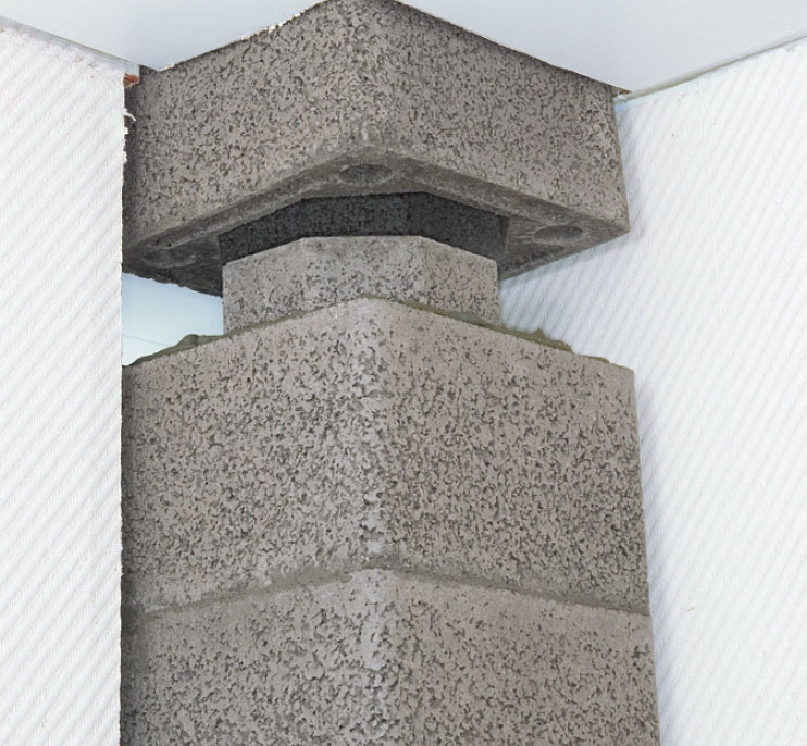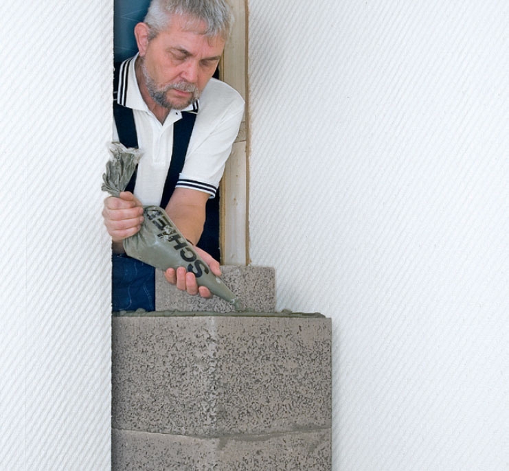 När de nedersta blocken är på plats, betongen har härdat och alla delar står vågrätt så går det snabbt att stapla skorstenen. Limmet pressas ut på ovansidan av varje block i så tjocka strängar att blocken verkligen limmas ihop, men inte så mycket att det blir förbindelse mellan kärnan och det yttre skalet.