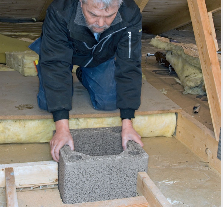 Du kan köpa specialblock till den nedre delen, dels sådana som har förskjuten kärna i förhållande till ytterskalet, dels block med öppning för sotningsluckan. Här visar vi hur du med lite extra jobb klarar dig med standardblock.