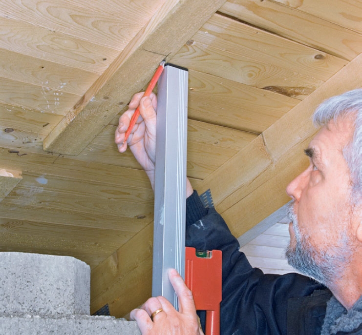 Hålet i underlagstaket markeras med hjälp av vattenpass, och det görs när skorstensblocken är tätt intill taket. Här är det ganska lätt, eftersom underlagstaket är fast. Är det av plast blir det svårare och då får du improvisera lite.