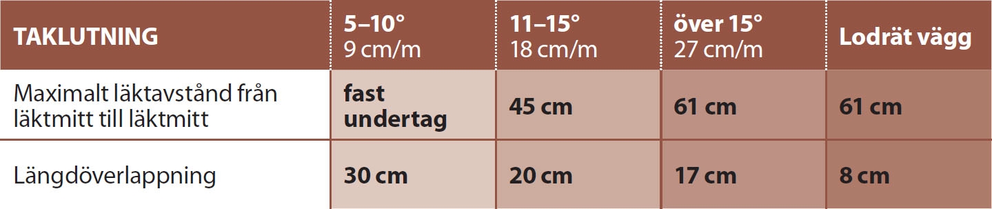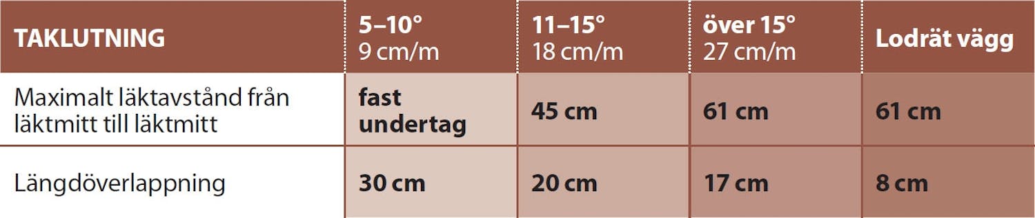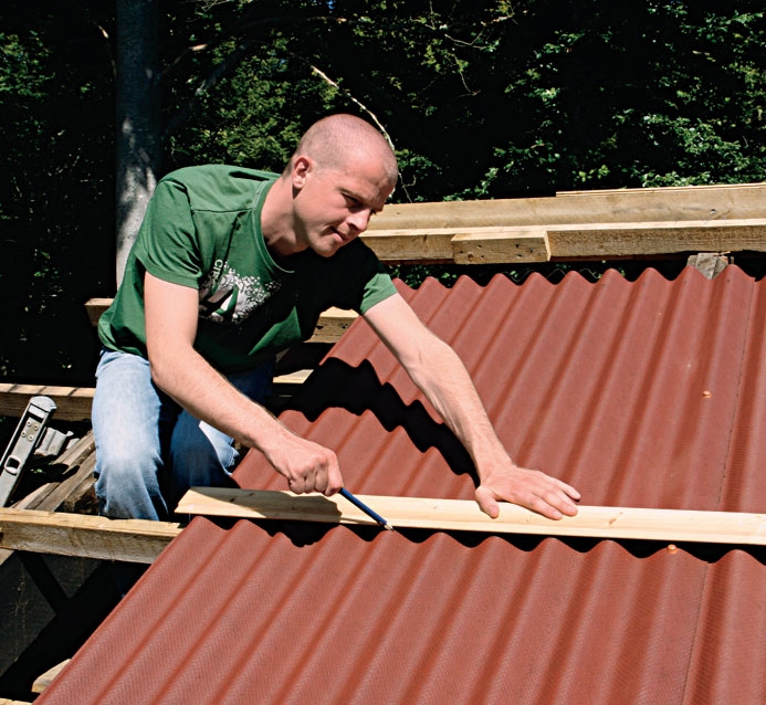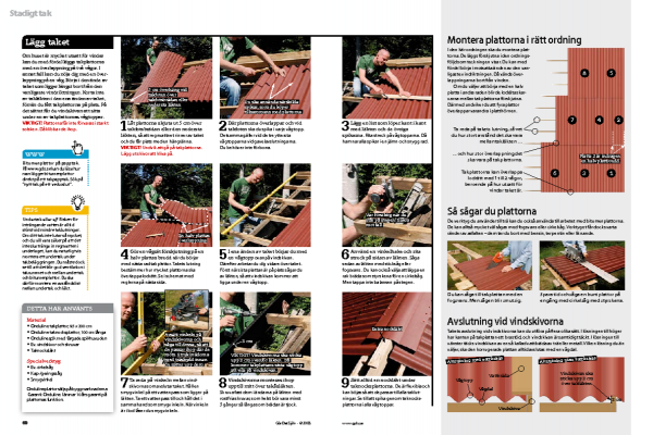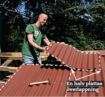 Om huset är mycket utsatt för vindar kan du med fördel lägga takplattorna med en överlappning på två vågor. I annat fall kan du nöja dig med en överlappning på en våg. Börja i den ände av taket som ligger längst bort från den vanligaste vindriktningen. Korta inte av takläkten i den ena änden av taket, förrän du fått takplattorna på plats. På det sättet får du vindskivan att sitta under en av takplattornas vågtoppar.