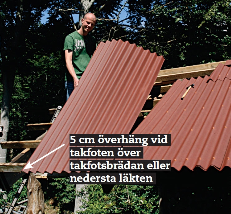 Låt plattorna skjuta ut 5 cm över takfotsbrädan eller den nedersta läkten, så att regnvattnet rinner av taket och du får plats med en hängränna.