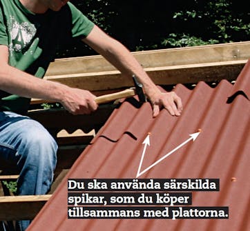 Där plattorna överlappar och vid takfoten ska du spika i varje vågtopp. Detsamma gäller vid de tre yttersta vågtopparna vid gavelavslutningarna. Du behöver inte förborra.