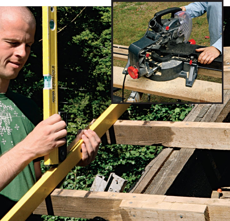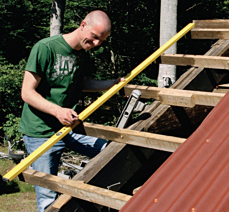 Använd en vinkelhake och rita streck på sidan av läkten. Såga sedan av läkten med sticksåg eller fogsvans. Du kan också välja att lägga en rak bräda som styrskena för en cirkelsåg. Men tappa inte balansen på stegen.
