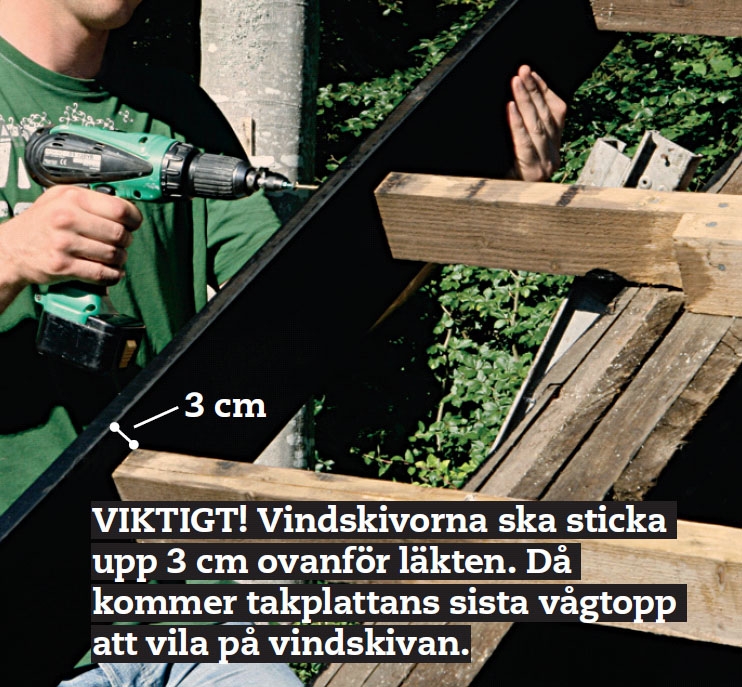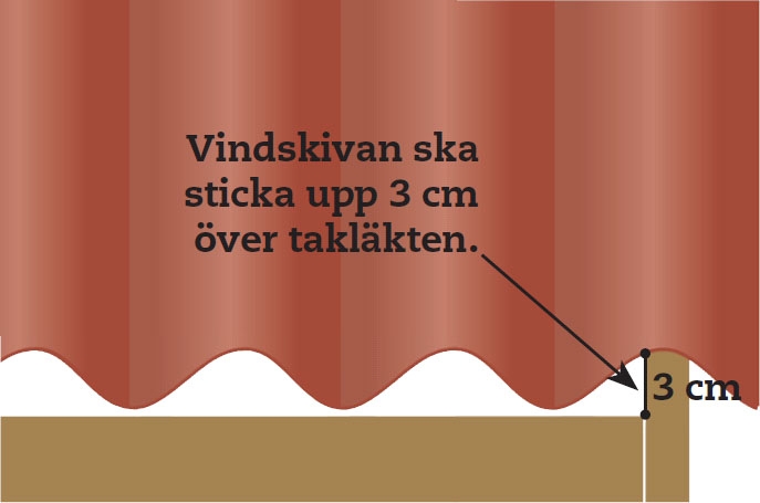 I ena änden av taket börjar du med en vågtopp ovanpå vindskivan. Därefter arbetar du dig vidare över taket. Först när sista plattan är på plats sågar du av läkten, så att vindskivan kommer att ligga under en vågtopp.