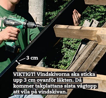 Vindskivorna monteras ihop upptill mitt över takåsläkten. Skruva fast dem i ändarna på läkten med rostfria skruvar, som helst bör vara minst 3 gånger så långa som brädan är tjock.
