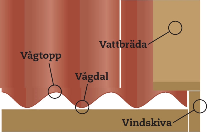 Takets avslutning vid vindskivorna kan du utföra på flera olika sätt. I lösningen till höger har kanten på takplattan ett bra stöd, och vindskivan är samtidigt täckt. I lösningen till vänster täcks vindskivan av en så kallad vattbräda av trä eller metall. Vilken lösning du än väljer, ska den korrugerade plattan alltid avslutas med en vågdal.