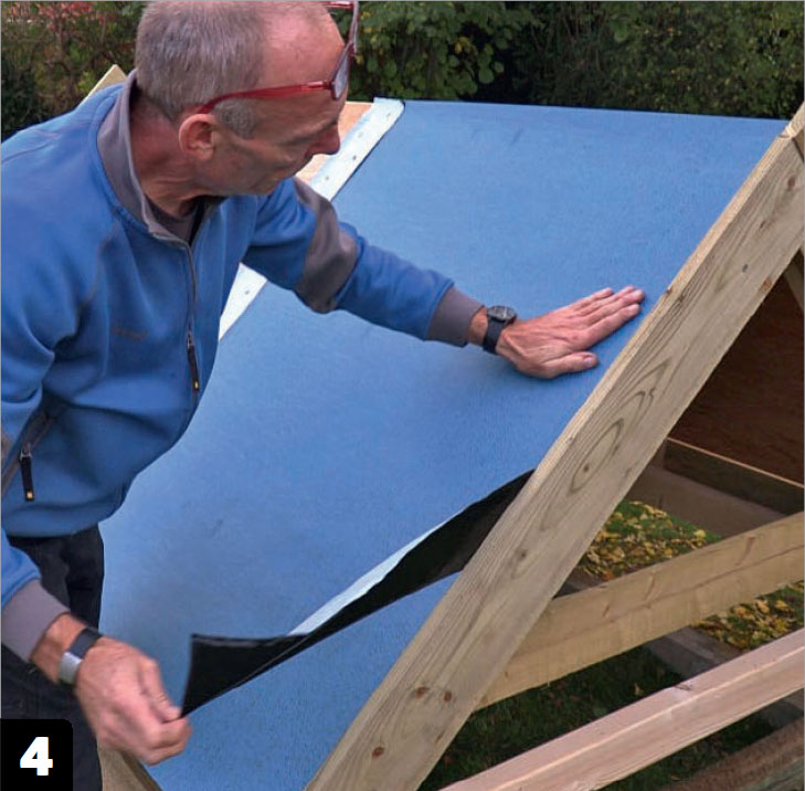 Ta bort resten av plastfolien och tryck fast pappen över hela ytan. Fortsätt med nästa våder och anpassa den sista våden när den är fäst överst på vindskivan.