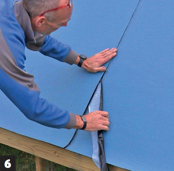 Ta bort skyddsfolien vid överlappet och tryck fast ordentligt. På den sista våden vid motsatta änden ska i regel klisterbiten skäras bort. Lägg ett par strängar asfaltsklister längs vindskivan och spika fast pappet.