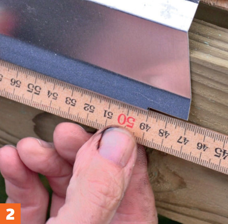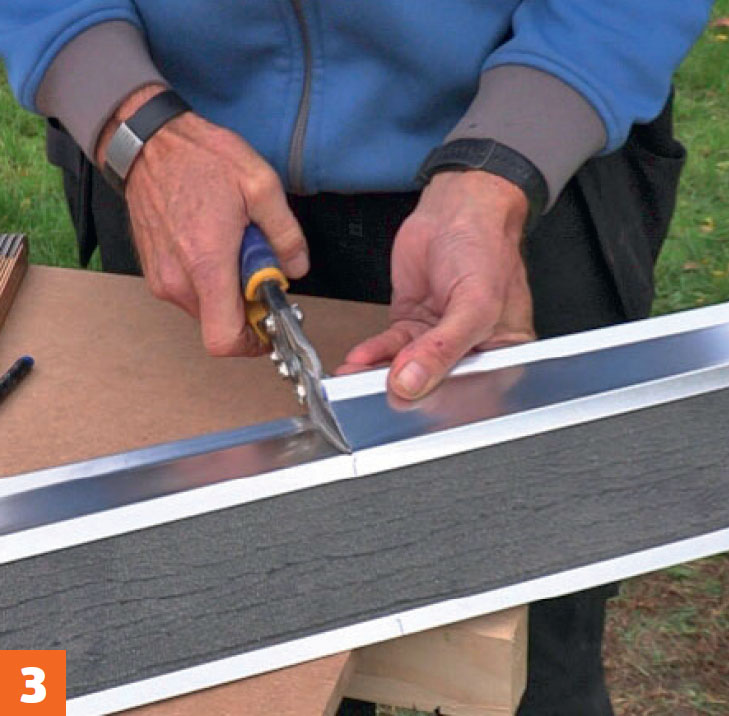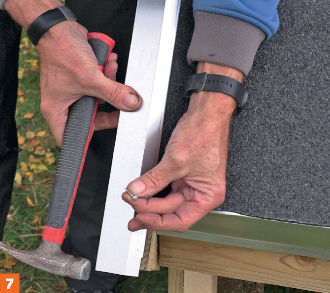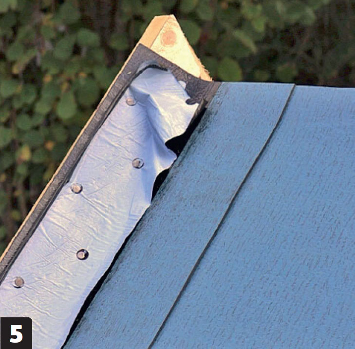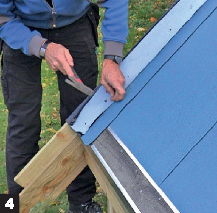 Var noga nere mellan vindskivan och takfoten. Det krävs lite fingerfärdighet för att anpassa pappen där det går ner över trekantsregeln längst ner. Skär till och fäst med asfaltsklister och en spik.