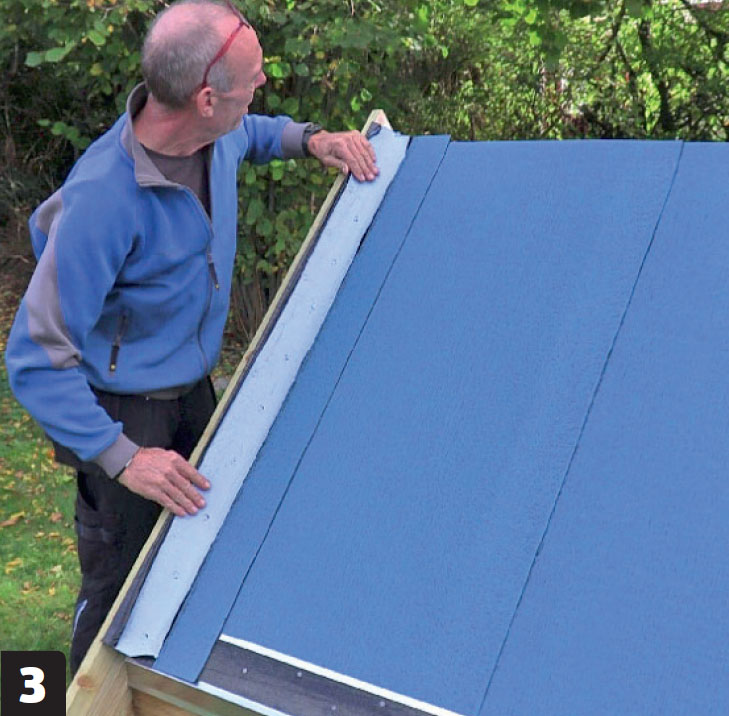 Första våden läggs upp. Börja med en klisterremsa på baksidan ut mot vindskivan, men dra ännu inte av skyddsfolien. Räta in pappen så att det följer vindskivan, nocken kan skäras till senare.