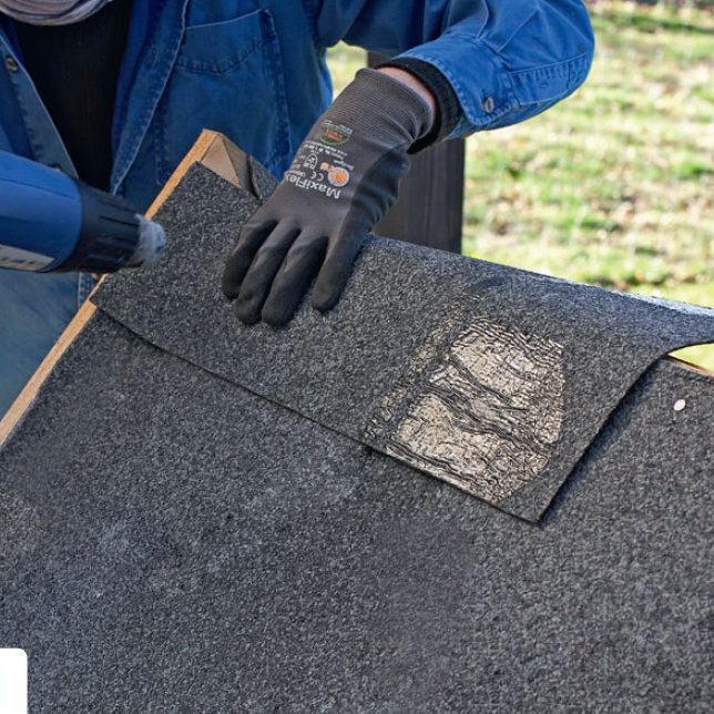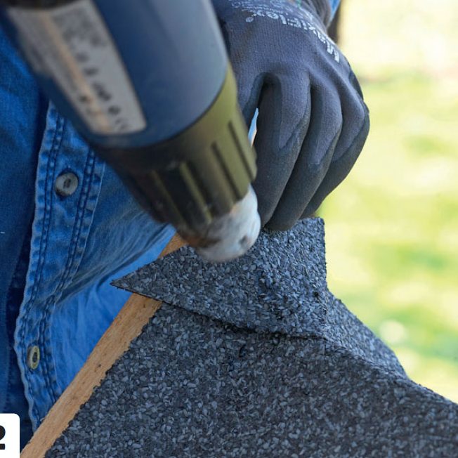 Lägg en remsa ytpapp på taknocken och du kan mjuka upp den med en varmluftspistol. Lägg 2-3 strängar asfaltsklister på varje sida om nocken och tryck fast pappen. Använd en träkloss och en hammare till det.