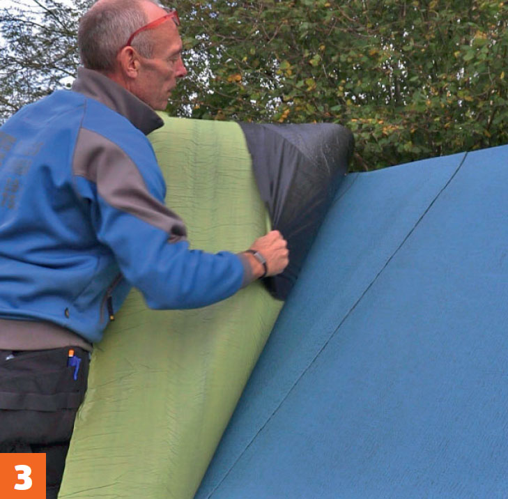 Börja att ta bort folien i det översta, inre hörnet. Folien sitter fast ordentligt, så håll våden i luften och drag lugnt och stilla. Lägg på pappen inifrån och ut på nocken. Vänta med att ta bort folien vid takfoten.