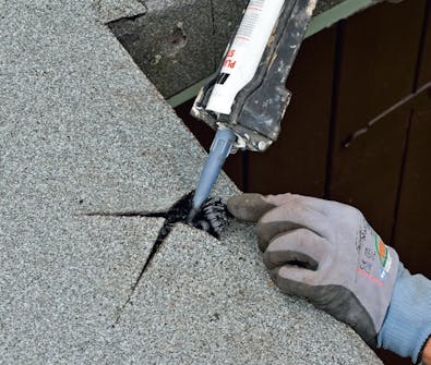 Fördela kittet med en spackel och pressa ev. fast en lagningslapp av takpapp i kittet och kitta längs kanterna på lappen.