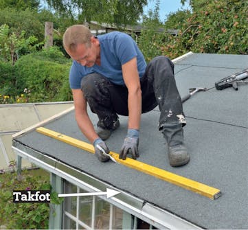 Montera takfotsplåtar på taket om det inte redan finns sådana. De ser till att regn- och smältvatten inte kan rinna in under takpappen och skada taket.