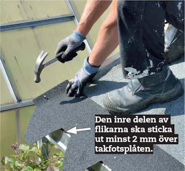 Bocka ner shingeln ordentligt mot taket. Om plattorna verkar styva och solen inte får dem mjukare så värmer du dem med varmluftspistol.