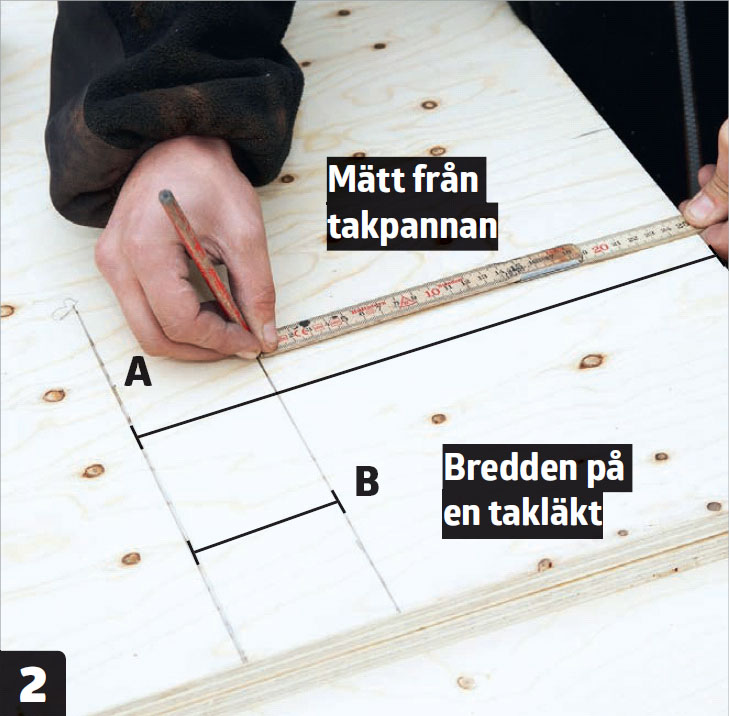 Markera måttet längs kanten på en skiva och rita ett streck (A) vinkelrätt in på skivan. Därefter ritar du ett streck (B) parallellt med det första på ett avstånd som motsvarar bredden på en takläkt.