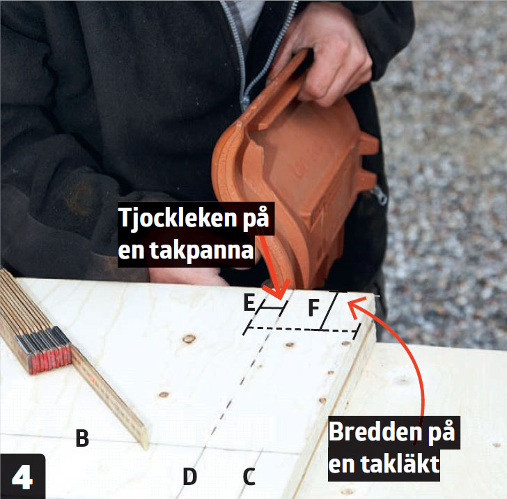 Markera takpannans tjocklek (E) vid änden av strecket (D). Markera också tjockleken på en takläkt (F) i hörnet. Det är den läkten som du sedan ska såga i den vinkel som du precis har markerat.