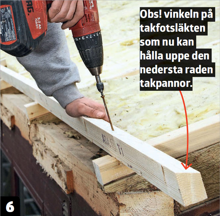 Takpannor är gjorda för att kunna ligga ovanpå varandra, så att det blir plant. Det ger problem med den nedersta pannraden, som ju inte har något under sig att ligga mot. Därför kan man bygga en takfot som leder bort eventuellt vatten från undertaket och samtidigt lyfter den nedersta takpannan. Takfoten lyfts av en takfotsläkt som sågas i rätt vinkel. Den kommer vi fram till genom att göra en rad markeringar på en träskiva och därefter föra över markeringarna till takfotsläkten. Sedan är det bara att såga till den med en cirkelsåg.